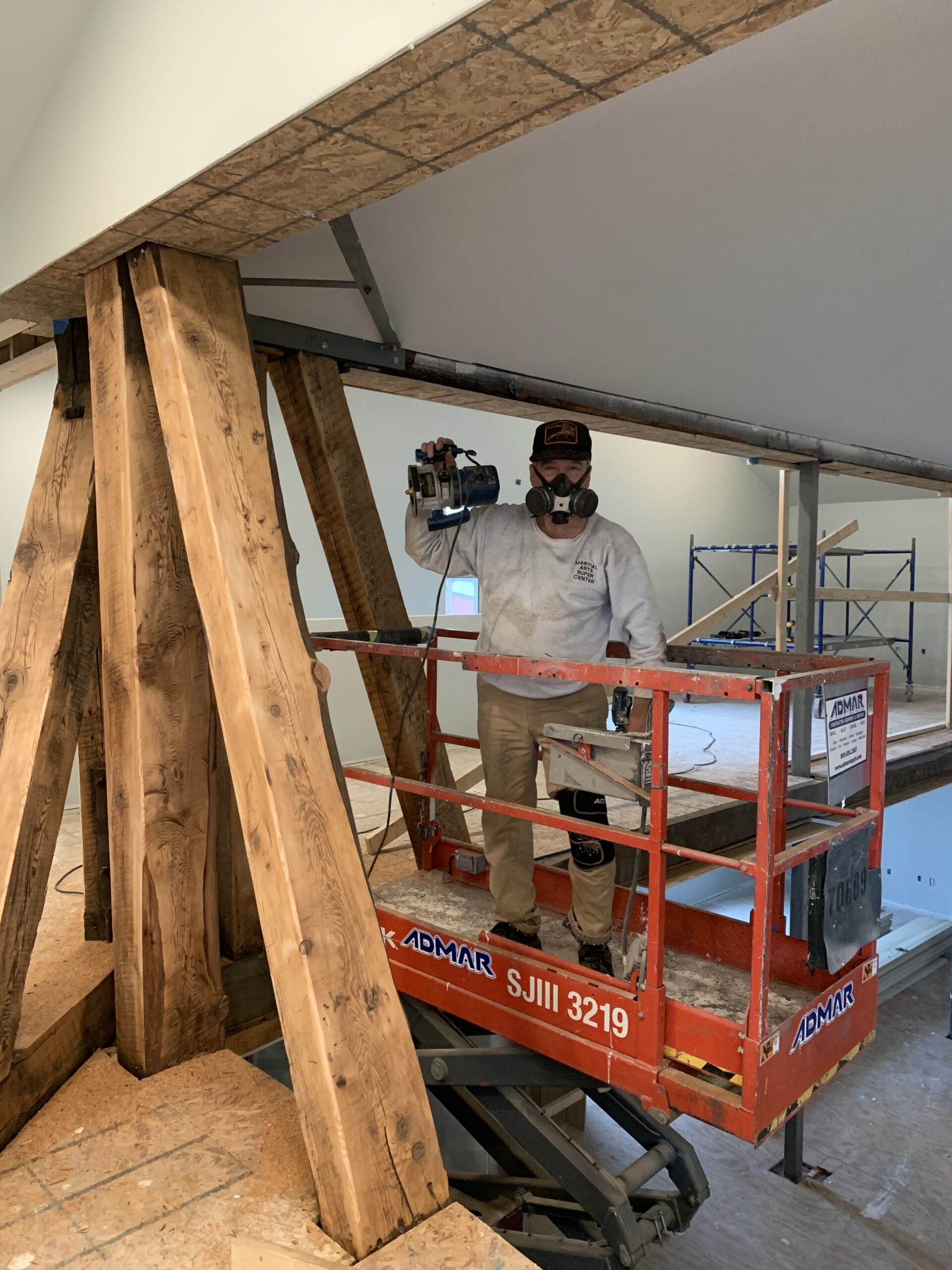 Image note: Board President Earl Freling adds some personal touches to the woodwork.